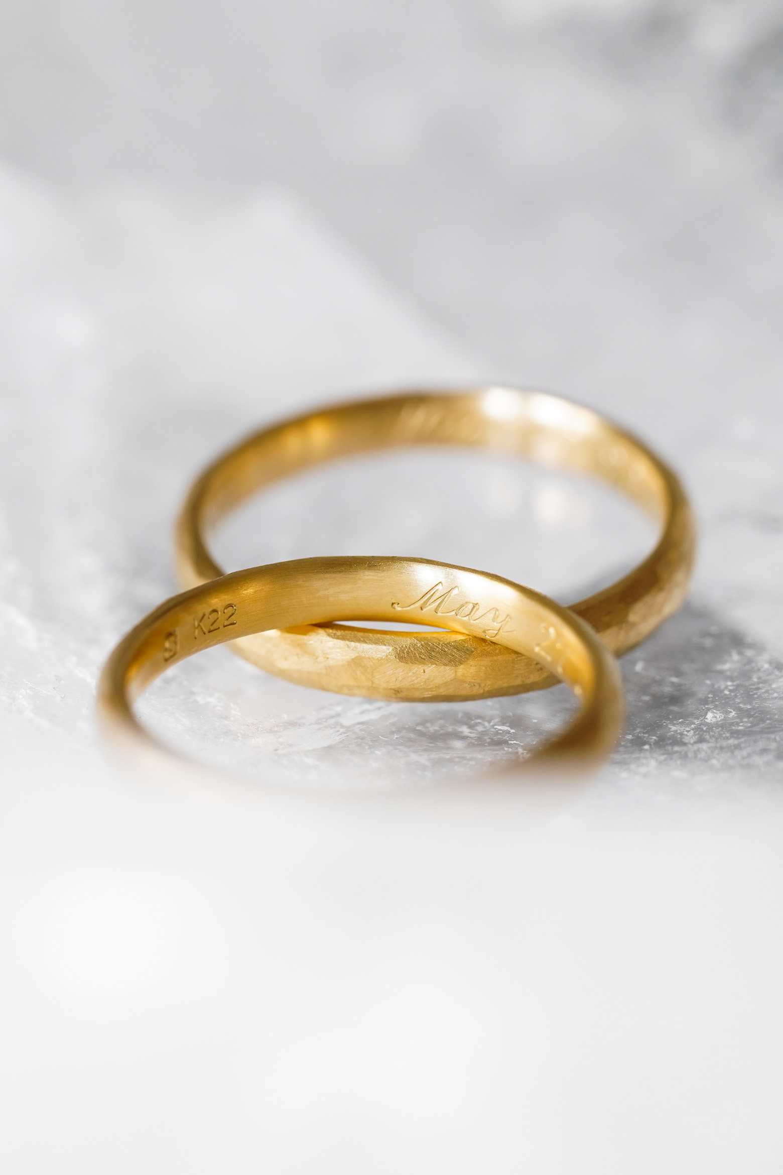 22kt Gold Classic Engagement Ring Plain / 0.14ct Hexagon Rosecut Diamond Lady's 22kt Gold Classic Marriage Ring Narrow Hammered Men's 22kt Gold Classic Marriage Ring Wide Hammered